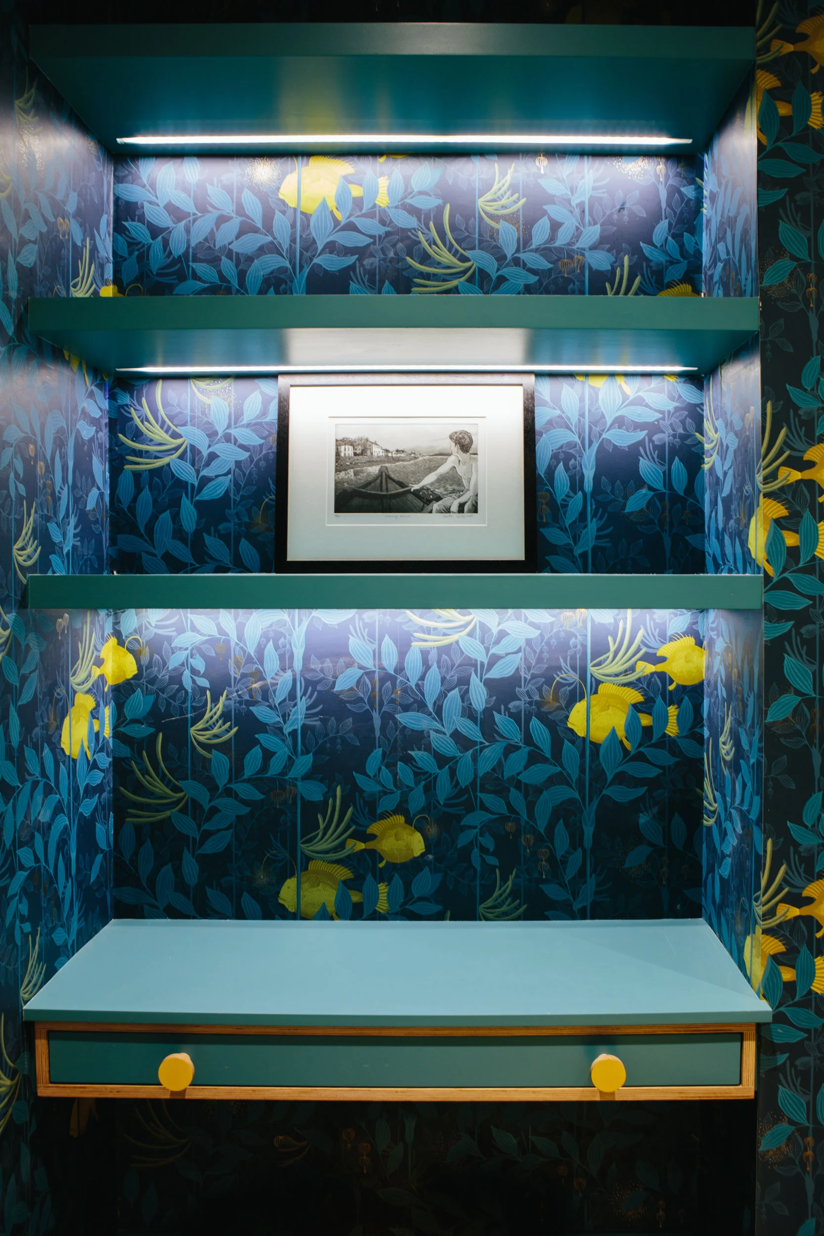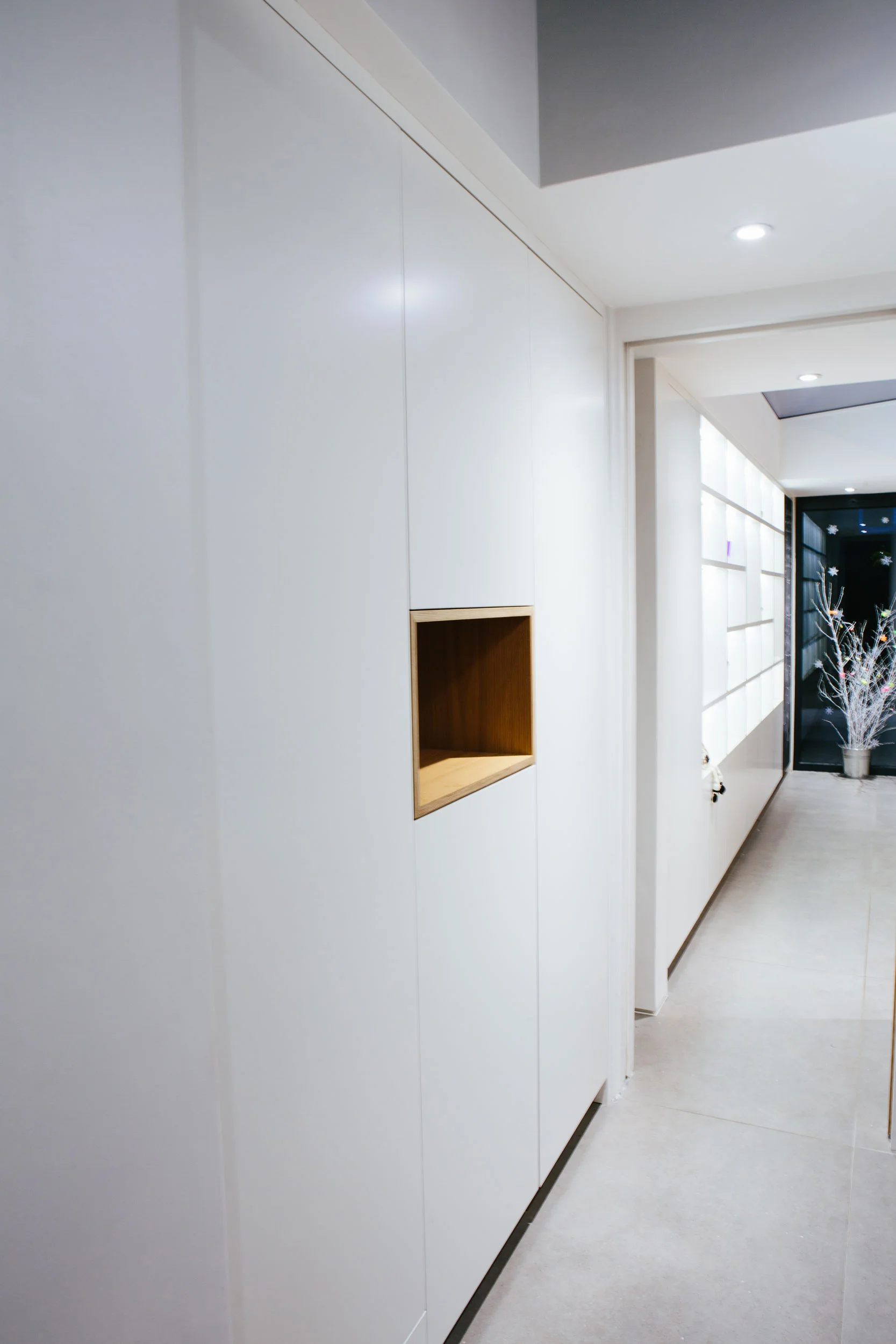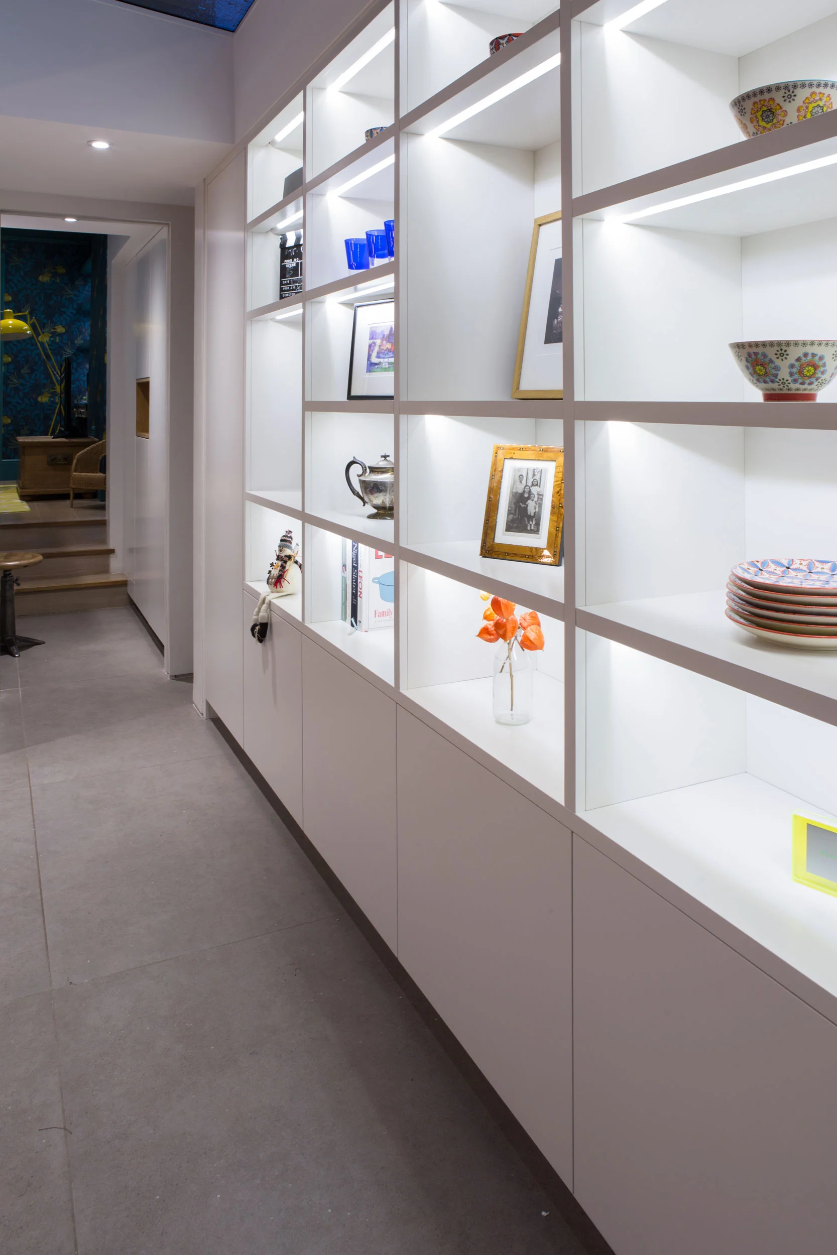 The shelving unit in this carpentry project has angled recessed lighting, meaning the led's are never in direct view. The unit is spray painted, with a spray painted chalkboard door at one end. We also built a cupboard with an oak veneered plywood display box, and an alcove desk and shelving with recessed lighting.