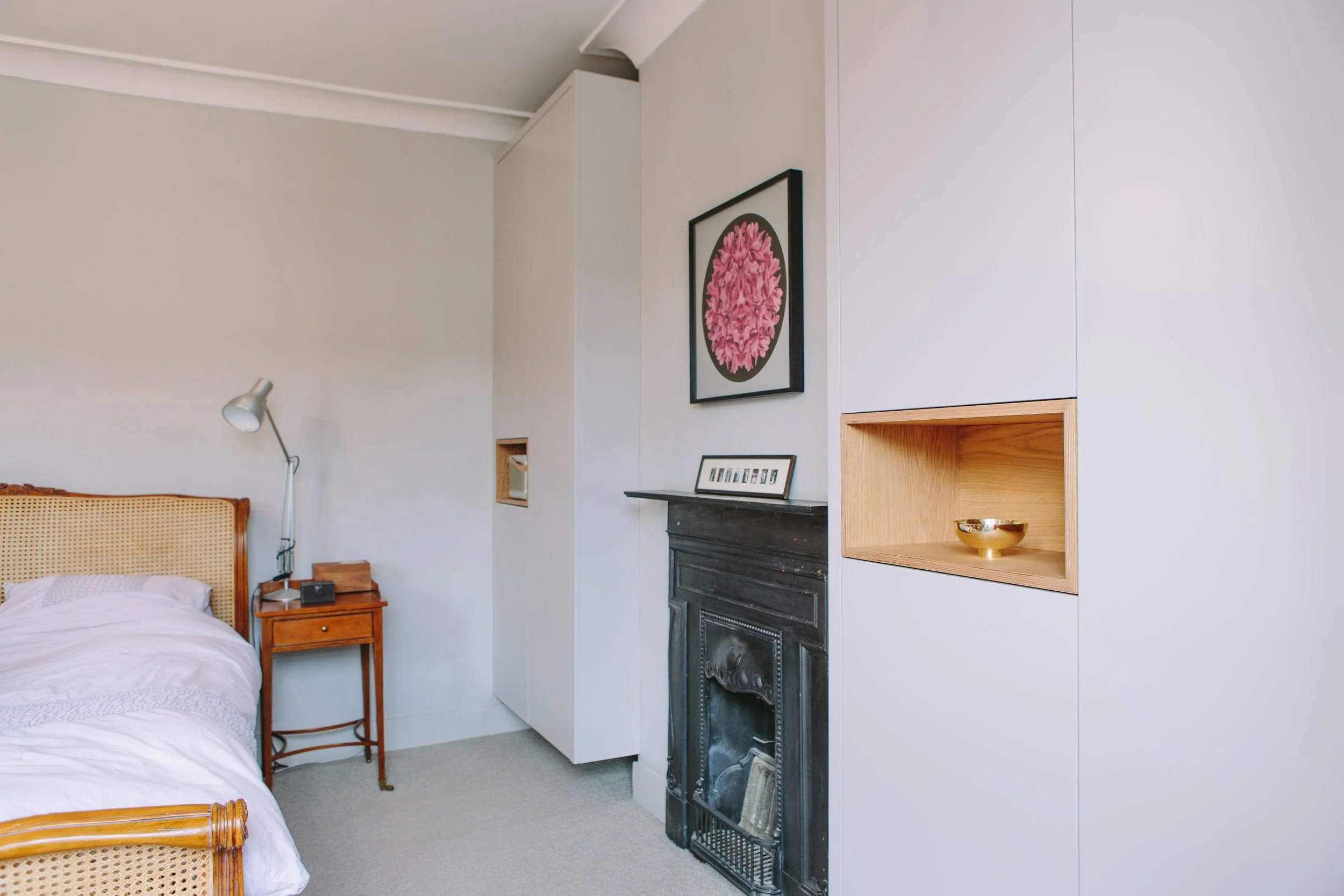 Our clients had a very specific brief for these wardrobes, which have a complicated bespoke interior. But what makes them really stand out, along with the beautiful oak-veneered plywood boxes, is that the wardrobes are completely floating, with no feet and no plinth.